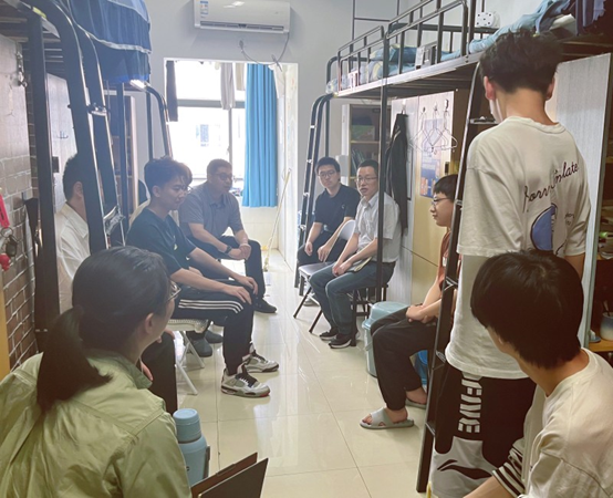 蒋伟中一行走访了机制221班所在10号学生宿舍楼430、432、433、434寝室,实地调研学生遇到的困难和关注的问题,并在430宿舍与同学们进行了亲切的交流,详细询问了大家的学习进展、生活状况以及临近考试等复习安排情况,针对学生关心的入党、考研、交流联谊活动等情况进行了耐心的解答。此外,为确保学生在酷暑时节安心学习、备考,国采党支部给班级34名学生,每人送上一瓶风油精,让处于复习备考的学子们能够防暑降温。