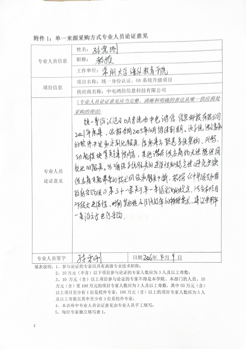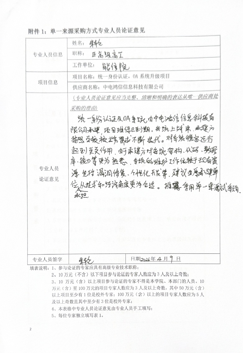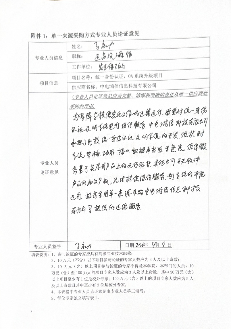 采用单一来源采购方式的原因及相关说明:统一身份认证及OA系统由原开发公司基于自研或专有技术框架独立设计、开发并部署,其源代码、数据结构、接口协议、权限模型及业务流程均具有高度唯一性、定制性和非公开性。目前,系统原厂维保服务已到期,为确保维持系统的延续性、数据安全性和运行稳定性,规避更换服务商可能带来的数据迁移、系统兼容、业务衔接等风险,确保面向师生的身份认证与办公服务高效可靠,本项目拟采用单一来源采购方式,继续委托原系统开发公司提供后续技术支持与服务。
